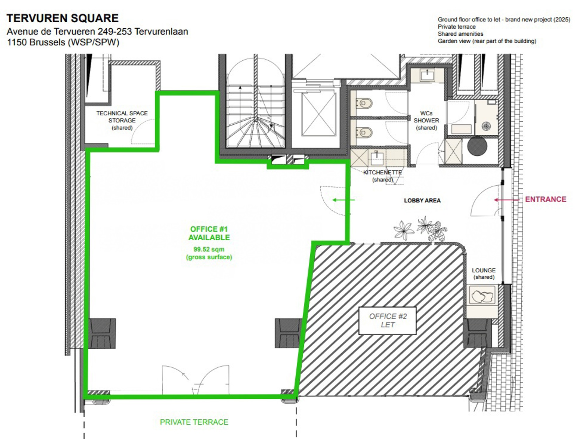 Magnifique bureau "clé en main" situé au rez de chaussée d'un nouvel immeuble haut de gamme, avec une terrasse privative (orientation sud). Situation privilégiée dans un des quartiers les plus recherchés de Bruxelles. Proximité immédiate du Parc de la Woluwe, de Montgoméry et du Parc du Cinquantenaire. Nombreuses facilités dans les environs (commerces, restaurants, fitness, écoles...) et facilement accessible en transports en commun.Loyer HTVA All Inclusive: